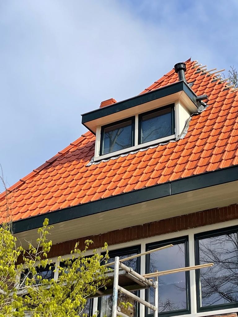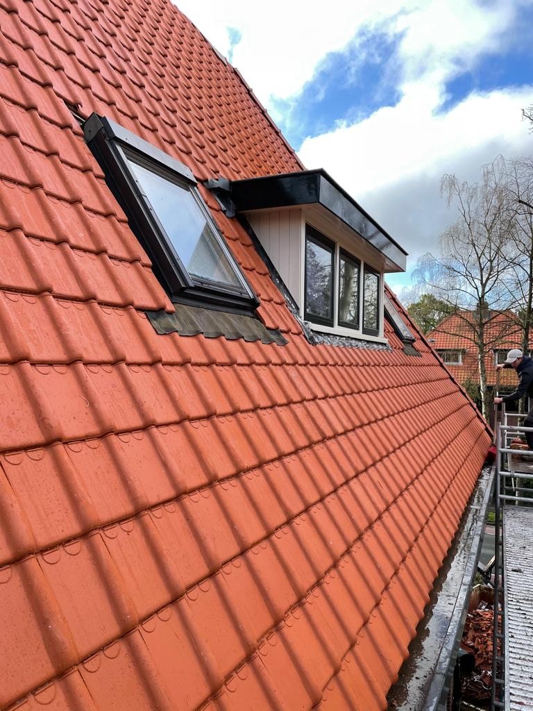 Bij deze mooie 2 onder 1 kap hebben we het hele dak vervangen met een mooie strakke nieuwe dakpan. Er is hier gekozen voor de Tuille du Nord pan in Natuurrood koramic.